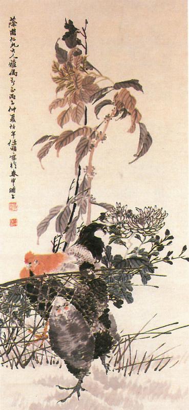 晚清任伯年畫了好幾幅雞圖軸,附圖是其中一幀,有黑羽雞品種。他畫的雞,風格與上述李鱓迥異。任伯年以寫生手法畫雞,乃寫實而非大寫意,可說是村郊生活的寫照。他畫雞不像筆下人物那麼形貌奇突而帶誇張,但同樣散發一股鄉土氣味。