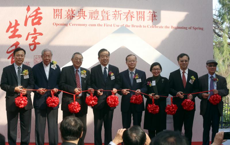 圖:開幕主禮嘉賓合照。左起:羅江、施子清、鄭培凱、蘇士澍、楊健、許曉暉、文宏武、陳萬雄/ 大公報記者黃洋港攝
