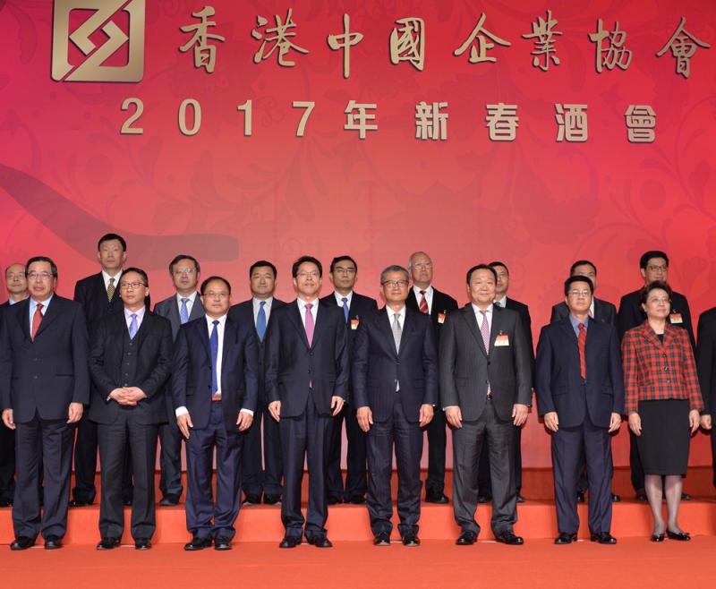 圖:署理行政長官陳茂波(前右四)和中聯辦主任張曉明(前左四)出席香港中國企業協會2017年新春酒會。圖中前排為立法會主席梁君彥(左一)、律政司司長袁國強(左二)、外交部駐港公署副特派員胡建中(左三)、香港中國企業協會會長岳毅(右三)、解放軍駐港部隊副政委蔡永中(右二)、中聯辦副主任仇鴻(右一)及其他嘉賓在酒會上合照