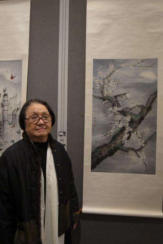 圖:畫家劉蘭芳,其旁作品為《冷月寒梅》 大公報記者劉毅攝