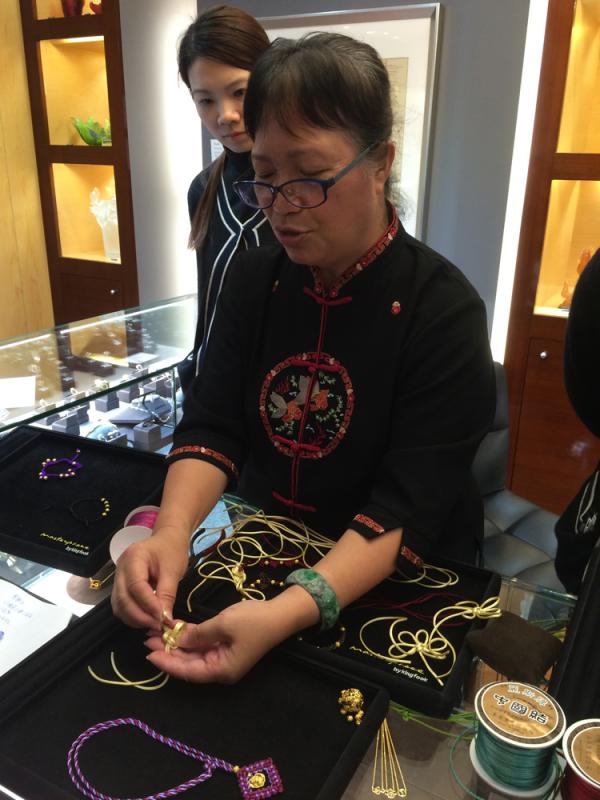 張寶賢現場製作了兩款繩結與金飾的搭配,一款為以「盤長結」結合金珠而成,代表着平安是福。「盤長結」是佛門八寶之一,八寶又被稱為八吉祥,盤長為第八品,結合金珠,寓意如意吉祥、平平安安。