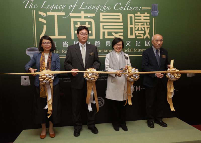 圖:良渚文化展開幕式:(左起)譚美兒、雍泰鶴、許曉暉、羅榮生主持剪綵\大公報記者林少權攝