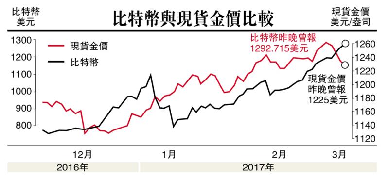 雖然以黃金與比特幣比較並不恰當,原因是貴重的黃金是以重量來衡量價值。在周四,黃金每盎司(約31克)在周四收報1233美元。至於深受科技業人士歡迎的比特幣,則全是由市場來定價,但兩者相似之處是同樣有較大的保值能力,並在個別界別方面有很重要的影響力。