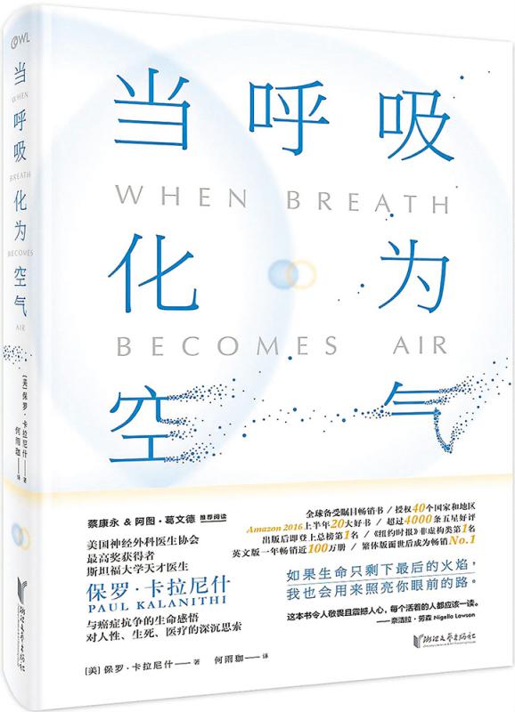 就在我慶幸生之歡欣之時,一位終日拿手術刀與死神搏鬥,仁心仁術的醫生卻因癌症而闔然長逝,在與癌症相伴的兩年裏,他留下了十萬餘字的生命筆記,《當呼吸化為空氣》是他生命最後的傑作,天然去偽飾的靈魂文字不分國界地感動了數以萬計的讀者。書中,有對他學習以及職業生涯的回憶敘述,有其與癌症纏鬥的過程,更有其在患病期間依然回歸手術台英雄史詩般的壯舉,還有他對家人、朋友的生命關照,更重要的是他留下了一位在醫學與文學之間遊走的人間良醫,關於生命價值與意義最後的天問。