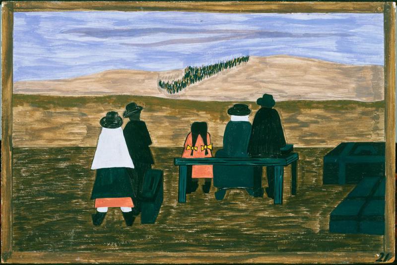 幾乎與「哈勒姆文藝復興」同時,一場綿延數十年的「大遷徙」運動也在美國本土展開。大量黑人從南部鄉村遷往北部城市,以尋求更好的教育、就業以及生活環境。勞倫斯於一九四一年完成的成名作「遷徙」系列,用了六十件小尺幅的蛋彩畫,描摹了這一漫長遷徙中的若干場景。這一系列作品均以群像形式展開,畫中男女要麼在車站中等待,要麼穿行在田野中,攜家帶口,身旁少不了行李箱和大小包裹,總之,都是「在路上」的樣子。