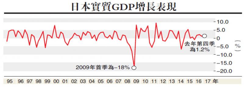 日本第四季度增長步伐轉強,日本政府和日本央行當可紓緩一些壓力,因為日本政府和決策官員一直希望商界增加投資,以協助經濟進一步擴張,以及提升生產力。然而,增長尚未足以實現日本央行的通脹目標,加上美國總統特朗普提倡貿易保護主義,令到日本出口商對經濟前景持審慎態度,不願意大幅調高工資,故阻礙日本的消費和經濟活動。