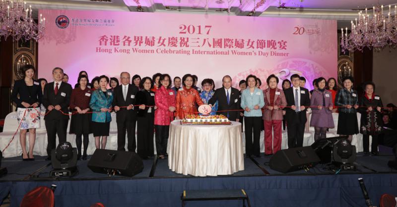 圖:香港各界婦女聯合協進會日前舉行「2017慶祝三八國際婦女節晚宴」,行政長官夫人梁唐青儀(前排左八)、政務司司長張建宗(前排右七)、中聯辦副主任仇鴻(前排右六)、外交部駐港署理特派員佟曉玲(前排左六)等出席主禮\大公報記者林少權攝