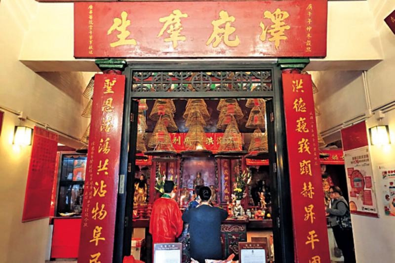 我平時較少踏足大角咀,好幾年沒有到訪洪聖殿。最近所見,它彷彿脫胎換骨,這基於二○一三年進行了一次重修。過去在廟前庭院加建上蓋,用來懸掛塔香,令人看不見廟宇全貌。現在上蓋已拆,陽光照射下來,光猛通爽。廟內燈光亦比以前明亮,牌匾文字清晰可見。其中一塊「澤庇羣生」,是廣華醫院當年董事在庚午年(一九三○年)敬贈;另一塊「眾藉恩光」由「深水埗黃埔船澳弟子」於民國十九年(一九三○年)贈送,後者見證了大角咀的船塢歷史。