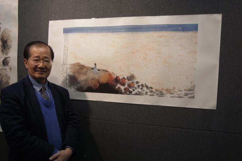 圖:沐風畫會會長劉孟寬,其旁作品以《大江東去》入畫\大公報記者劉毅攝