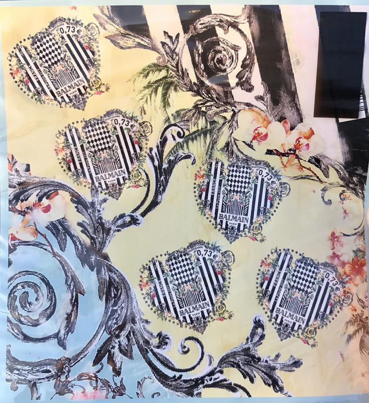 這是法國郵政每年都會和一個時尚品牌合作發行的郵票聯印小全張。我仔細地端詳着今年的設計,和往年習慣一樣,心形的郵票形狀融合在一張正方形的整體畫面中。而與往年熱烈的色彩相比,今年的色彩並沒有太多往常的「情人節顏色」,譬如紅色粉色紫色之類,整個畫面反而是淡黃色和灰藍色的為底,黑白相間的圖紋為主調,只在很少的地方有些許的紅色點綴。即便是這樣,紅色的點綴也幾乎融入了黃色的背景中。