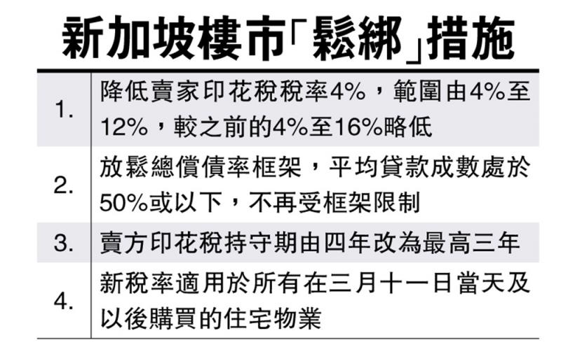 最新措施包括賣方印花稅持守期由原本的四年改為最高三年,各級賣方印花稅稅率均調降4%,範圍由4%至12%,之前是4%至16%。新的稅率適用於所有在三月十一日當天及以後購買的住宅物業。新加坡政府同時放寬總償債率(TDSR)框架,平均貸款成數處於50%或以下,不再受框架限制。