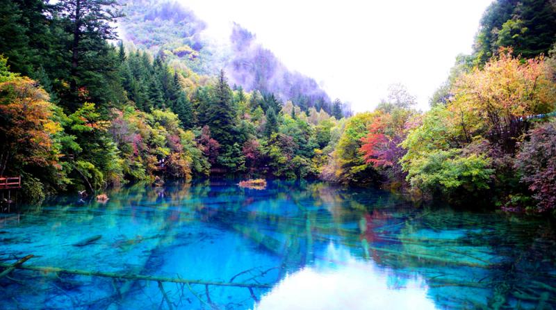 走過「天鵝湖」,便是充滿浪漫氣息的「公主海」,她爭着把我們帶入縹緲的童話夢。這真是一位名副其實的公主,是九寨溝這個童話王國中的公主!海底依舊是藍中帶綠,但不同的是,這麼亮麗的海水,在周圍大山的襯托下,顯得更加迷人與高貴。她使我想起童話故事中的人魚公主,海水的色彩凸顯出她的靚麗,海水的平靜象徵着她的溫柔與善良,透過澄明見底的海水,我們可以飽覽海底的岩石奇觀,這也令「公主海」變得更加如夢如幻,潛藏着人魚公主與王子雖然短暫但動人的愛情故事。我的團友們說:「這是最自然、最高貴、最美麗的公主,它毋須任何裝飾就傾國傾城。」難道不是嗎?來自五湖四海的朋友們都迫不及待地用「長槍短炮」(照相機),留下與「公主海」在一塊的甜蜜瞬間。