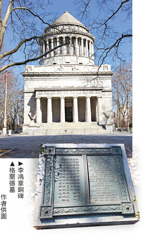 次年,美國大興土木為格蘭德建造巨墓及紀念堂,它就坐落在離今天哥倫比亞大學五分鐘路的左近。李鴻章不忘舊情,聞知此事後即委託其時清廷駐美重臣替他奉上禮金、銅碑並種樹兩棵誌念。至今,歷經百餘年的風雨,這塊銅碑和樹仍在墓側。凡來哥倫比亞大學參觀的友人,只要是有雅興的趣人,我都會帶他們去看看格蘭德墓旁的李鴻章樹。