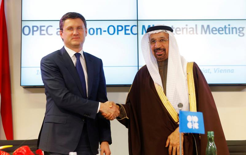 圖:油組和盟友本周末將於科威特開會商討減產成效,圖左為俄羅斯能源部長諾瓦克,右為沙特阿拉伯能源部長法力赫 資料圖片