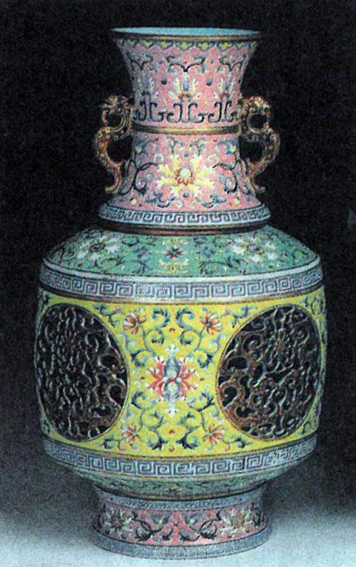 其實,乾隆前期及中期,亦多新奇器物。例如附圖的黃地粉彩描金縷空轉心瓷瓶(小獸型雙耳),即為典例。粉彩基本上是一種釉上彩;乾隆時不再限於白釉瓷胎,而愛加繪色地,像附圖轉心瓶的黃地和瓶肩的淡藍綠地。另見有些粉彩轉心瓶為綠松石色地、胭脂紅地、金地、或祭藍釉描金;故比較瑩潤淡雅及立體感強的雍正粉彩瓷器更多元化。