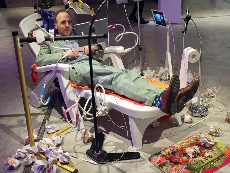 裝置作品《景觀.gif》由沙灘椅、懶人支架、毛毯、廢紙、iPad等日常用品組成,遠看「亂七八糟」的風格與展廳格格不入,不禁令人聯想到遊戲迷沉迷網絡久不出門的景象。在創作者苗穎的眼中,這就是我們生活的常態,下班回家躺在床上放鬆,發達的網絡讓我們可以足不出戶買到各式各樣的東西。作品中的每一件物品都有隱喻,比如印滿emoji表情符號和「讚」的毛毯,滿地「讚」字的廢紙,苗穎解釋:「在社交網絡上,就像微信或Facebook只有『like』(讚),沒有『dislike』(不讚),『點讚』變成一個機械性的動作,氾濫得就像廢紙一樣,無處不在。」