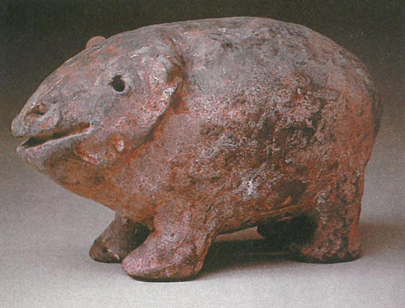 像附圖,乃於河南省鄭州出土的商代灰陶豬,十分珍罕。其造型肥笨可愛,富鄉土氣息;可能驟看不似豬,尤其是頭部、五官和四肢,寫實技巧不高;但顯現商代灰陶塑藝術的特色,而且或多或少繼承了我國新石器時代晚期與夏代的灰陶塑燒造法。