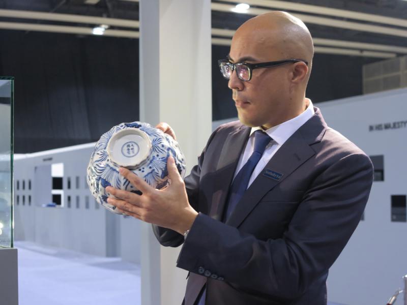 圖:仇國仕介紹,宣德青花魚藻紋大盌可說是宣德盌當中目前市場可見的最頂級的一個盌/大公報記者周怡攝