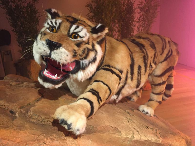 升降機門開啟的那一剎那,觀眾踏入迷霧縈繞展覽空間,穿過圓形拱門,步入仿真石山、竹林布置的「蘇州庭園」,牆壁上霓虹燈閃爍,分不清這是午夜時分的時代廣場,抑或清晨七、八點鐘的九龍公園。一隻嶺南風格的「猛虎」伏於展廳中央,居高臨下凝視着觀眾,吼叫,絮語,唱英文歌。它的形象,來源於一九三五年由萬金油品牌「虎標」創辦人興建的虎豹別墅,它已被列為一級歷史建築及進行保育。