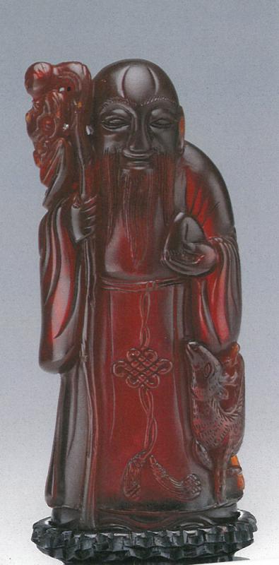 附圖為明代名家所雕「老琥珀」壽星公立像,持杖、捧壽桃,袖下方刻一小鹿,長袍中央懸垂「如意」繩結,寓意長壽得福、如意吉祥,乃古代民間眾人所期盼。由於琥珀特性為摩氏硬度低,着刀易脆裂,故原塊上等金珀或清珀雕成,以及能保存至今仍品相甚佳的雕像極稀。況且,這件「老琥珀」質佳色勻、明淨晶瑩,通透度高,益顯淡雅清澈;蓋內含琥珀酸愈少者,則愈潤澤透亮。