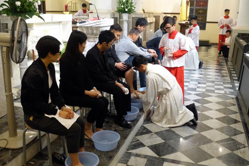 香港不少天主教堂在聖周四仿效耶穌為十二門徒洗腳的做法,神父在彌撒中講道後,輔禮人員在祭台前放了十二張櫈,櫈下有盆,十二位獲選定的教友坐下。過去只有男教友參與,現今社會開放,女教友亦見其中。主祭逐一跪在他們面前為他們倒水洗腳,再用毛巾擦乾。濯足禮進行期間,詩班詠唱聖歌。