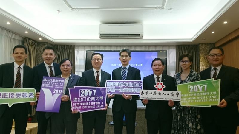香港中華出入口商會昨日舉行傳媒茶敘,介紹「進出口企業大獎2017」活動詳情,會長張學修、副會長兼秘書長陳勁、副會長陳建年、工商事務委員會主席彭楚夫、會董甘亮明、張洪鈞、工商事務委員會委員陳王瑋均有出席。容偉雄擔任今年大獎評審團主席,亦有到場。