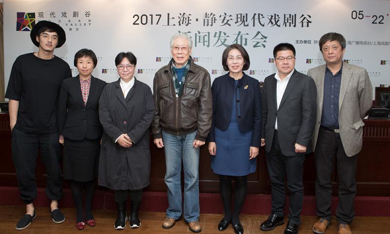 圖:開幕大戲《狂飆》男主演金世佳(左起)、中共靜安區委宣傳部副部長、區新聞辦主任周晴華,著名導演田沁鑫,著名表演藝術家焦晃,靜安區人民政府副區長鮑英菁,上海戲劇學院院長黃昌勇,2017上海.靜安現代戲劇谷總策劃孫孟晉在發布會上