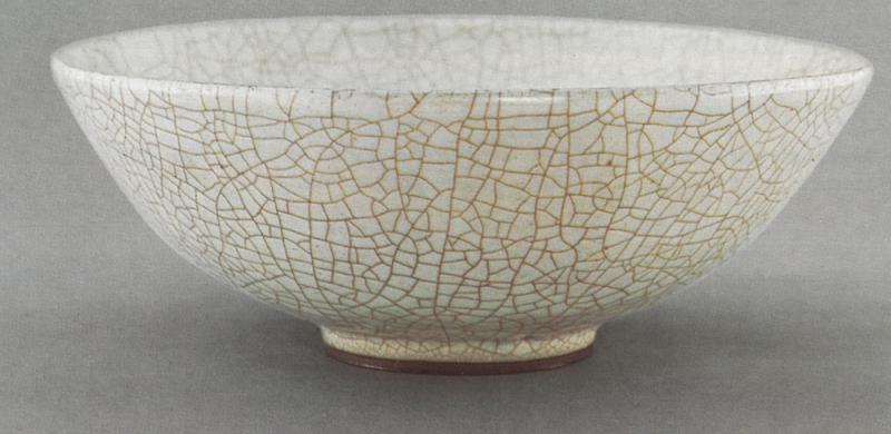 附圖為南宋時期燒製的傳世哥窰粉青釉瓷扁盌,黃褐色冰裂片紋滿布全器,俗稱「百圾破」。這些紋片本屬一種「窰病」,應由於胎釉的膨脹系數差異而導致,但反而使人感到是「缺陷美」。每件哥窰器的冰裂花紋截然不同,有些小如魚子,與宋代郊壇官窰器隱裂如蟹爪者有別。它們形狀及大小不一,但多疏密得中。由於燒成後釉色存在大量微氣泡,反而更顯瑩潤腴厚,不經意地造成特殊效果,益添藝術美感和玩味。這種「缺陷美」,打破了南宋以前單色釉瓷的單調與均衡,顯示並非「力求勻稱、完美無瑕」才是上品;美,可以從不同角度去領會欣賞。南宋哥窰器僅見傳世者;宋墓中歷來沒有出土器,可知應非隨葬品。