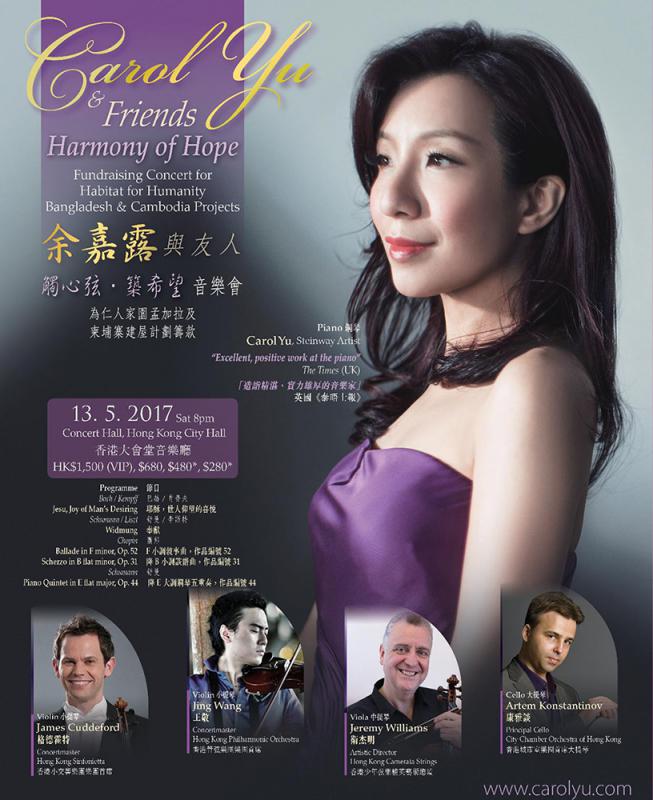 【大公報訊】著名鋼琴家及「史坦威藝術家」余嘉露,將聯同四位著名弦樂家:香港管弦樂團首席小提琴家王敬、香港小交響樂團首席小提琴家格德霍特、香港少年弦樂精英藝術總監中提琴家衛傑明及香港城市室樂團首席大提琴家康雅談,於五月十三日晚上八時,在香港大會堂音樂廳舉行一場「余嘉露與友人『觸心弦.築希望』音樂會」,支援國際非牟利建屋組織「仁人家園」(www.habitat.org.hk)在孟加拉及柬埔寨的建屋計劃。