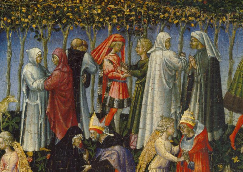 身處愛情中的情侶也好,互相依靠的母子也罷,常常借擁抱表達心意,而且,這種心意是極其私密的、排他的,不容他人干擾。不論在畢加索抑或在傑洛姆的畫中,擁抱的兩人是忘情的,自成一個封閉的小世界,旁人只得遠遠看着,不敢打擾。而在十五世紀文藝復興時期意大利畫家第.保祿(Giovanni di Paolo,一四○三─一四八二)筆下,畫中人藉由擁抱傳遞的愛意更普適且更廣博一些,是敞開的,邀請觀眾進入畫作呈現的氛圍與情緒中。