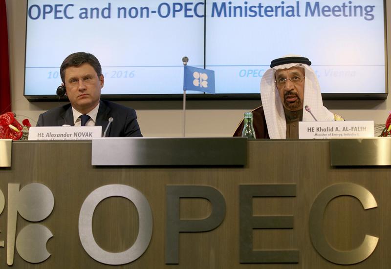 圖:油價腳軟,勢令油組成員國於本月開會商討減產協議時倍添壓力;圖左為俄羅斯能源部長諾瓦克,右為沙特阿拉伯能源部長法拉赫\資料圖片