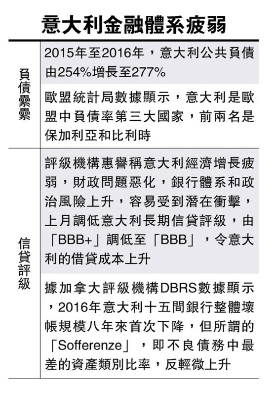 評級機構惠譽國際上月調低意大利長期信貸評級,由「BBB+」調低至「BBB」,降級理由是該國經濟增長疲弱、財政問題惡化、銀行體系和政治風險上升,令到意大利容易受到潛在衝擊。在歐洲經濟出現復甦跡象之際,意大利的金融體系依然是歐洲經濟的一個弱點,這拖累到意大利的公司和消費者的償債能力。