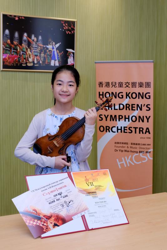 黃沛盈自二○一四年起於葉氏兒童音樂實踐中心隨老國茵習小提琴,先後奪取二○一五年第二屆「香港國際音樂節」小提琴兒童組第一名,並獲優勝者最終決賽的全場總冠軍。去年三月獲「第68屆香港校際音樂節」十九歲以下小提琴協奏曲組冠軍。