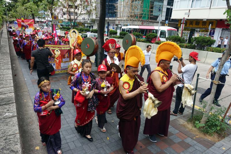 香港的尼泊爾佛教徒日前組織了一次遊行慶祝佛誕,走在前面的是三位捧着花瓶的小女孩,並有多名尼泊爾僧人吹奏和敲打傳統樂器,另外有人分別手持尼泊爾國旗和國際佛教旗。後面跟着大批穿上傳統服裝的信眾,他們舉起不同紙牌和佛陀畫像,宣揚佛的說話,並以中英文說明「佛出生在尼泊爾」。