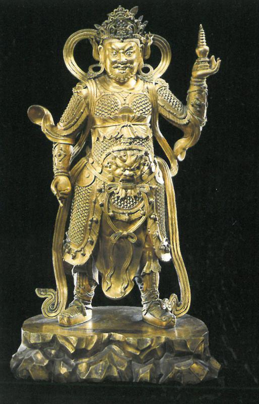 附圖為明代銅鎏金托塔天王立像(連原座)。造型威武有氣勢,盔甲紋飾細緻,神情肅穆,形象逼真。全像高約一百一十二公分;保存完好,更顯澄黃亮麗。鎏金像的形貌一反北魏崇佛時柔美溫雅和清風秀骨的體態面相。鎏金技術超卓,應屬永樂與宣德期間之作。那時鎏金工藝經宋、元兩代沉寂後,不但復興,尋且各方面俱有大突破;更發展了「灑金」技巧。工藝名師如朱震明和胡文明等,慢工出細貨,巧奪天工。