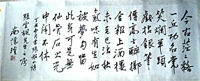 我與南老結緣的起因,主要是他有兩個弟子與我稔熟,這兩人一是劉方安,一是王大兆,劉是新華社香港分社(中聯辦前身)原宣傳部副部長。他不特引薦我謁見南老,還為我向他討了一幅墨寶,後來又安排在《文匯報》上刊載南老的《大學講錄》。王大兆是《文匯報》的台灣版主編,與南老是同鄉,兩人亦師亦友,每次王與我聊天時幾乎都會談及南老的道德學問以及他對家鄉的貢獻。尤其對南老倡議和牽頭集資從而建成金溫鐵路一事,更是讚不絕口。我受這兩位好友的感染,對這位名噪兩岸、幾乎亦凡亦仙的大學者心儀不已。一九九七年間,曾專門晉謁南老。