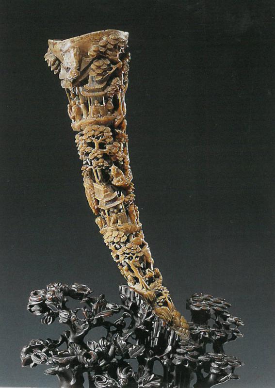 我國考古發掘,歷年只有鹿、牛、羊等角製品出土,迄今未發現古犀角器;明、清的傳世珍品極罕,所雕山水、木石、人物、花鳥等,縝密細膩,刻工精湛,纖瑣悉備,刀法遊刃自如;有些富自然情趣,宛如天成。歷來所見,以故宮博物院收藏最豐,次為上海博物館。明、清名家如鮑天成、尤侃、尤通、信孚和方弘等,大多擅長透雕和浮雕犀角杯(作乘槎形者為「吳中絕技」),以飲器名於世;但絕少像象牙雕,以原隻犀角雕成構圖複雜的山石、樹木、亭台和人物。像附圖,為清代名家所雕原隻犀角器,層層疊疊,松木、人物與小亭呼之欲出,雕工細巧若縷。自己雖然生性喜愛「大璞不斫」,但也不禁佩服作者的雕技卓絕。