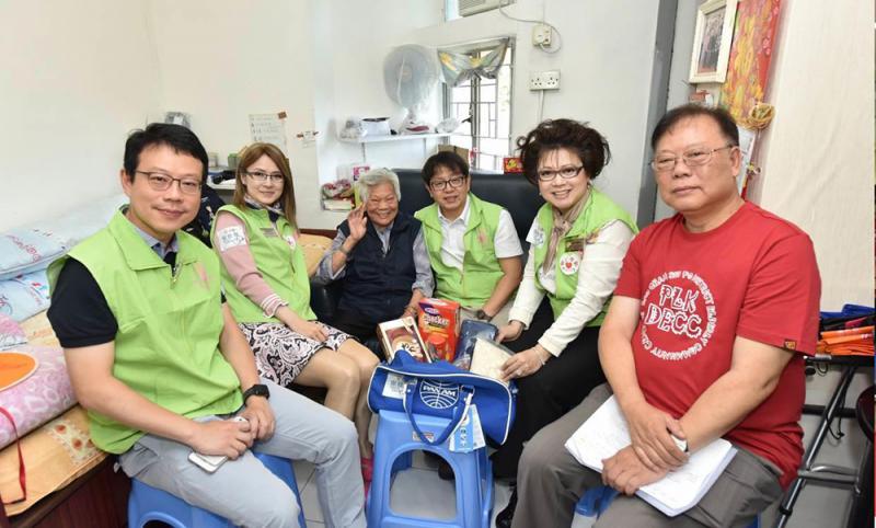 圖:蕭偉強(右三)、保良局陳細潔主席(左二)、劉陳小寶顧問(右二)及陳欽勉行政總監(左一)探訪獨居長者