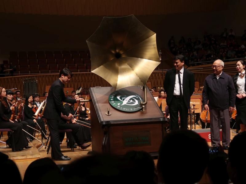 當晚開幕音樂會的開幕儀式頗為特別,觀眾進場已見到舞台指揮台的右側,裝置了一座「放大」了的古老唱片留聲機裝置,由上海作曲前輩呂其明將唱片置於唱盤上,繼而由葉小鋼將唱針放上,最後由擔任獨奏的小提琴家黃蒙拉搞動攀手,將唱盤轉動,播出音樂來,表達上海音樂界三代人傳承的意義。