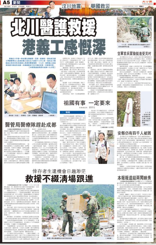 香港與內地,同根同源,心意相連。二○○八年的汶川大地震造成六萬九千二百八十二人死亡、三十七萬四千六百四十三人受傷。 特區政府派出了專業拯救隊馳援救災,義工和慈善團體組織物資送往災區,包括《大公報》在內的港媒記者走進震區,報道災情和救災狀況,全港掀起捐款救災的空前熱潮,多年後回顧,當時情景仍歷歷在目,令人熱血沸騰。