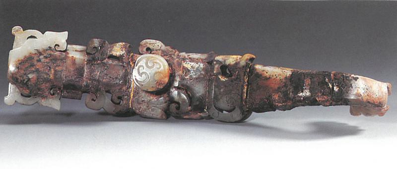 附圖為西漢時期琢製的「八節」鐵芯青玉龍虎帶鈎,造型與設計匠心獨運,雕琢特別,工藝精湛,十分珍罕。俯視呈長身獸形,鈎體用八節大小不同的玉塊組合;每節中心貫穿一孔道,以一根特製長鐵芯穿連起來。窄小的鈎端乃龍首,較方闊扁平的尾端為虎頭;餘下中間六節飾龍虎合體紋,其中一節背凸雕一圓鈕,可僅僅插進革帶的豎口中,好比我們扣緊衣鈕。由於貫穿長鐵芯,經埋墓下逾二千年,不斷水侵土蝕,生銹的鐵芯得四周水銀之助,把鐵銹滲進每節玉塊中,形成棕褐色;全因久歷駸駸歲月天然形成,反而增加古拙蒼勁味。