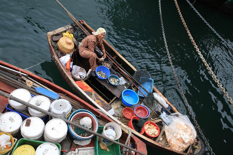 沿着海邊走到盡頭,看到色彩繽紛的碼頭,可以乘坐傳統舢舨街渡前往香港仔珍寶碼頭或行人隧道口,成人收費二元二角、小童一元二角。當日見到很多外籍遊客坐舢舨街渡,享受漁港風情。在海濱看見艇上一位女漁民正同岸上一位叔叔交談,好奇下望,只見女漁民正在將小魚的頭部剪去,她舉頭望着我說:「今日的魚一早賣清光了。」原來很多人一早來此處買海鮮,貪其價廉物美。
