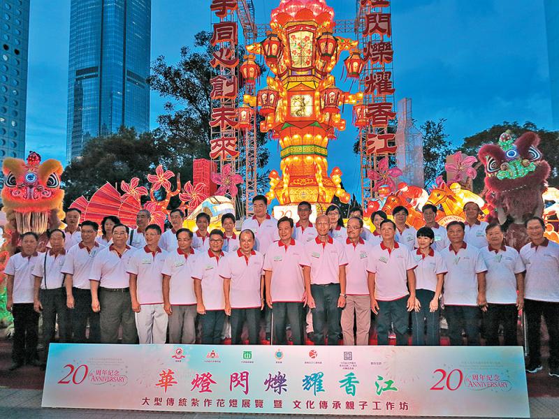 圖:「華燈閃爍耀香江」傳統花燈亮燈儀式昨舉行,眾嘉賓背後的是大型吊籃花燈大公報記者 周怡攝