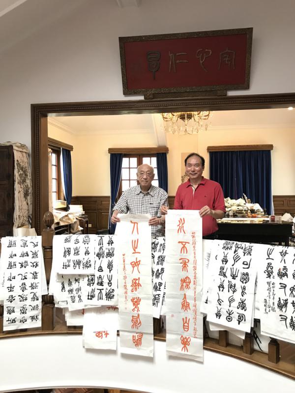 圖:張國恩(右)向滬港文化交流協會會長姚榮銓贈送硃砂對聯「水不求深魚自樂,人之好吾鹿則鳴」\大公報記者張帆攝