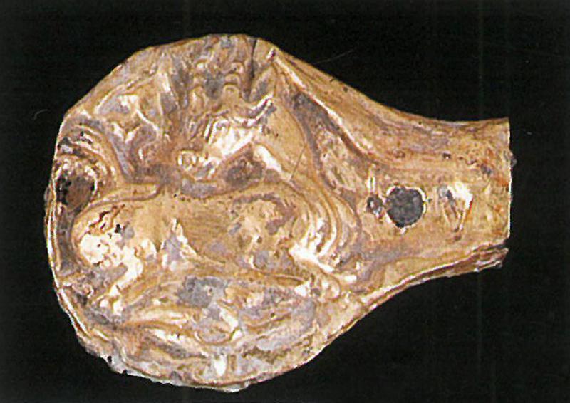 附圖包金箔飾件造型亦獨特,也有小孔;而用「錘沖凸」法捶壓出的羊紋,好比「凸浮雕」。若工藝不到家,很難達到形神兼備的效果。