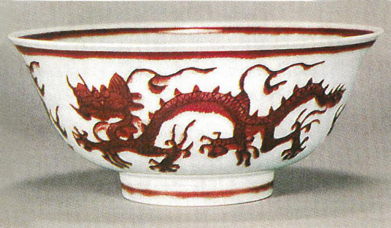 例如附圖,為撇口碗,繪紅游龍;碗口徑約二十一公分。宣德「釉裏紅」雖然源自元代始創期的基本燒法,但進展良多;不再像元代及明初洪武時期那樣大多發黑或發灰,色調也沒有呈粉紅或黑紅般晦黯。由於對「銅紅釉」的呈色技巧掌握恰當,故紅色明快鮮艷,色調勻稱穩定,濃淡隨意;與瑩潤的「桔皮」白釉互相輝映。後來更結合成為「青花釉裏紅」雲龍器,諧協一體。