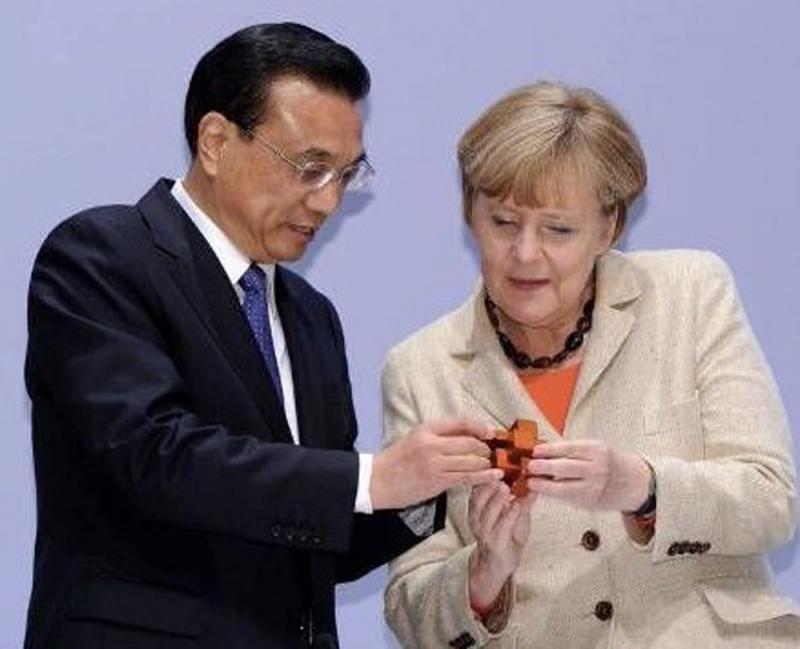 圖:總理李克強與德國總理默克爾交談魯班鎖/網絡圖片