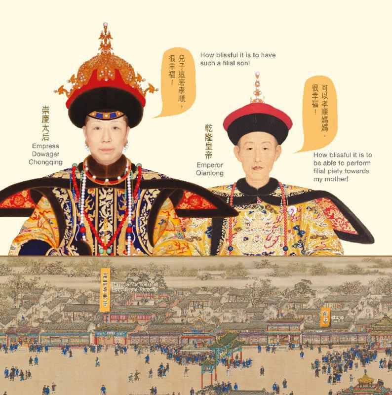 該時期的繁華盛世可從崇慶皇太后六十大壽的慶祝活動及各項措施中體現出來。乾隆皇帝命畫師把慶祝活動畫成四卷總長逾百米的《崇慶皇太后萬壽圖》。展覽以插圖形式介紹其中一小節畫作,鉅細無遺地描繪從萬壽隆興寺到仿黃鶴樓的一段路上遊人如鯽的盛況。展覽亦介紹當時的特色建築,包括孔雀翎翡翠亭、壽桃形戲台、大型西洋樓、群仙祝壽景點,路上到處張燈結綵,小販叫賣,商舖、寺院林立,人們購物、逛街、看戲,活像現今大型嘉年華。