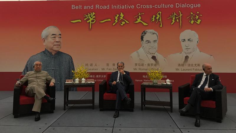 圖:「一帶一路」文明對話;左起:范曾、羅馬諾.普羅迪、洛朗.法比尤斯