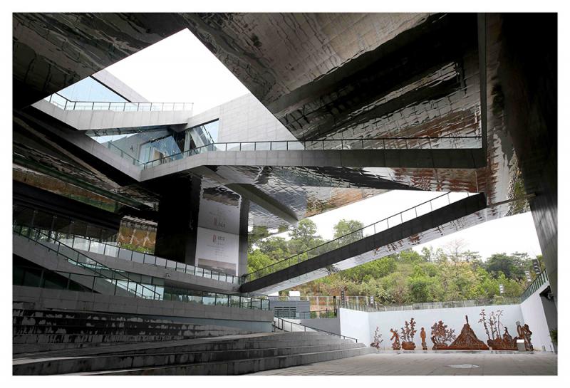 圖:中國版畫博物館抬高架設於兩個山丘之間,下方是開放的空間